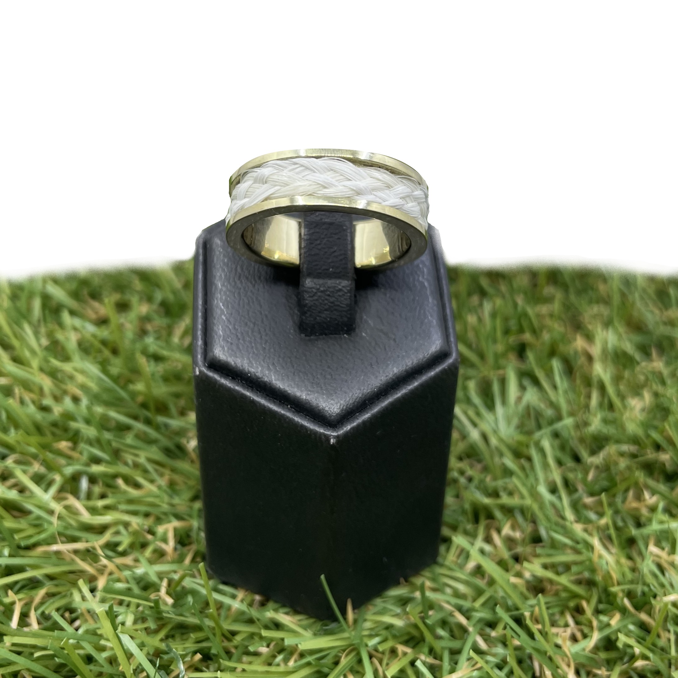 De 14 karaat gouden ring brede baan is opvallend door zijn platte vlecht gemaakt met 5 strengen. Kan op twee manieren gedragen worden met het afwerkplaatje, waar de haren onder vast zitten, aan de onderkant of je draait hem andersom. Op het afwerkplaatje kan je een gravure zetten en ook aan de binnenkant kan de naam, tekst of datum gezet worden.